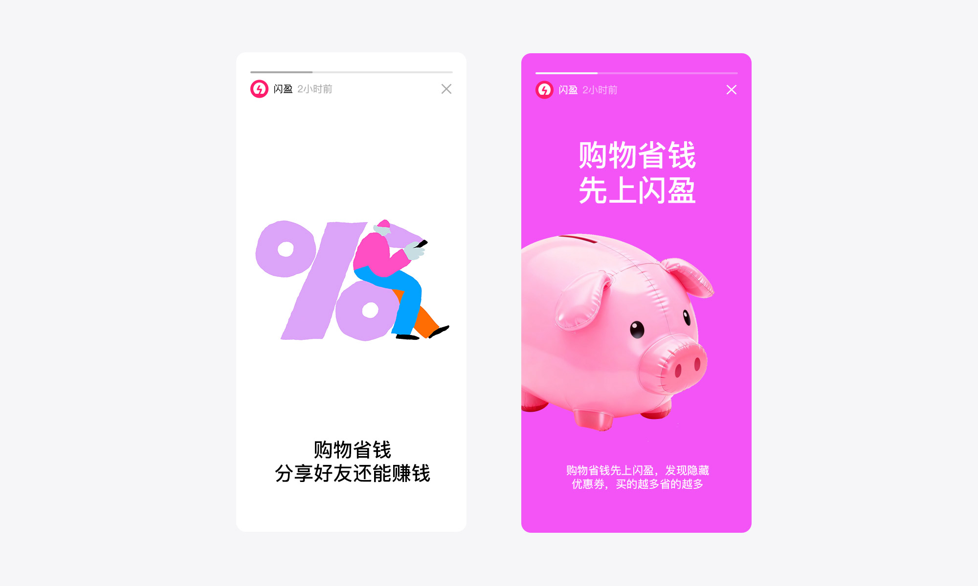 LOGO造型为一枚快要放入小猪存钱罐的金币,暗示产品主题为省钱、存钱,闪电符号也来自文字LOGO“闪”盈中的符号,形成更深刻的记忆点,一目了然。