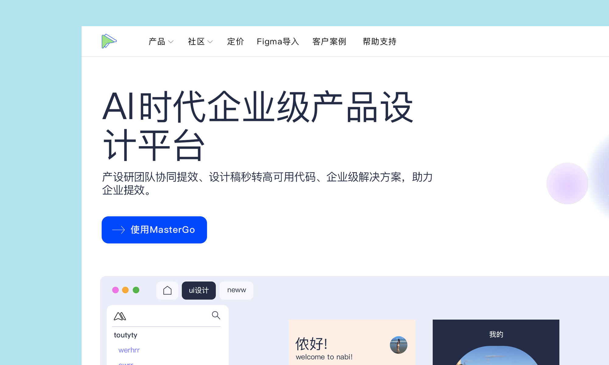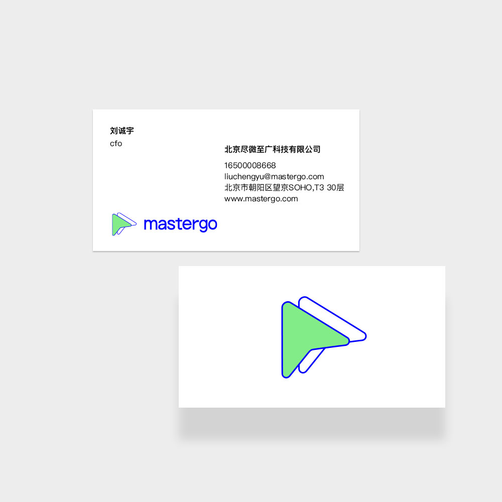 MASTERGO的用户为互联网产品设计行业从业者,年龄大多在25-35岁之间,设计风格定位年轻化,颜色用比较清爽的蓝色,搭配浅色湖蓝和草绿。 logo造型用两个重叠线描的光标三角形,采用描边形式,刚好暗示了所属的产品设计工具行业。